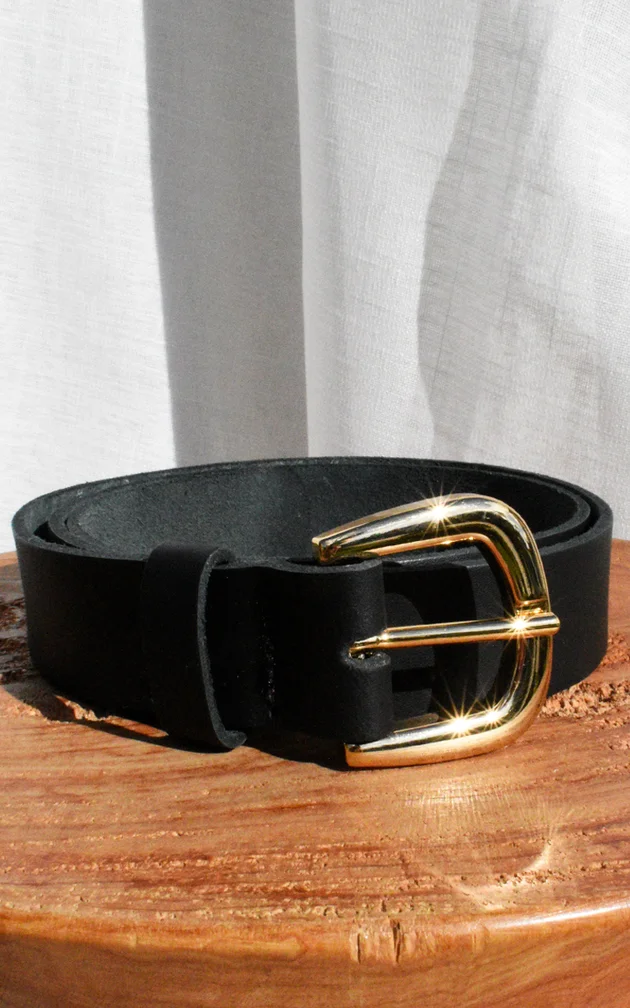 Elegância que atravessa o tempo. Este cinto é confeccionado em couro preto de alta qualidade e apresenta uma fivela arredondada com acabamento em banho ouro — um detalhe que adiciona sofisticação sem exageros.