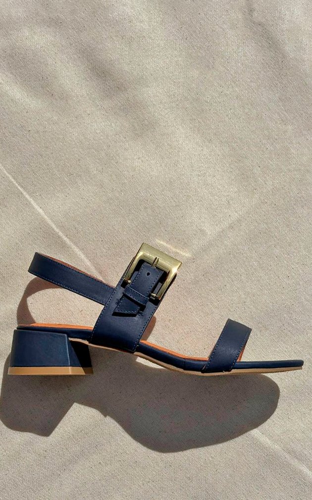 A tira fina e a fivela robusta em metal criam um contraste preciso entre leveza e presença. O salto bloco baixo, forrado em couro, traduz estabilidade e refinamento, acompanhando o movimento com conforto e firmeza.