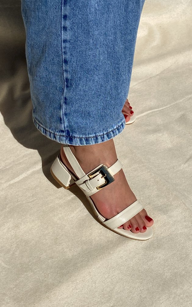 A tira fina e a fivela robusta em metal criam um contraste preciso entre leveza e presença. O salto bloco baixo, forrado em couro, traduz estabilidade e refinamento, acompanhando o movimento com conforto e firmeza.