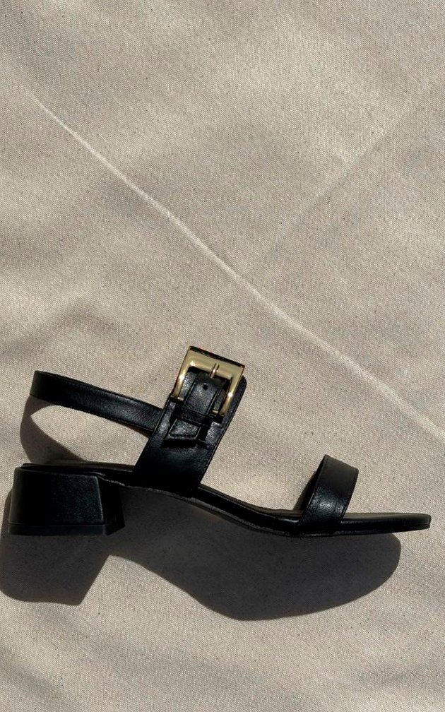 A tira fina e a fivela robusta em metal criam um contraste preciso entre leveza e presença. O salto bloco baixo, forrado em couro, traduz estabilidade e refinamento, acompanhando o movimento com conforto e firmeza.