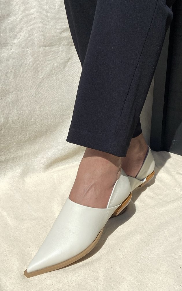 O bico fino alonga a silhueta com elegância, enquanto o salto baixo em madeira revela o encontro entre leveza e propósito. O contraste entre texturas traduz um olhar contemporâneo sobre o clássico, ideal para mulheres que valorizam conforto, estilo e autenticidade no mesmo compasso.