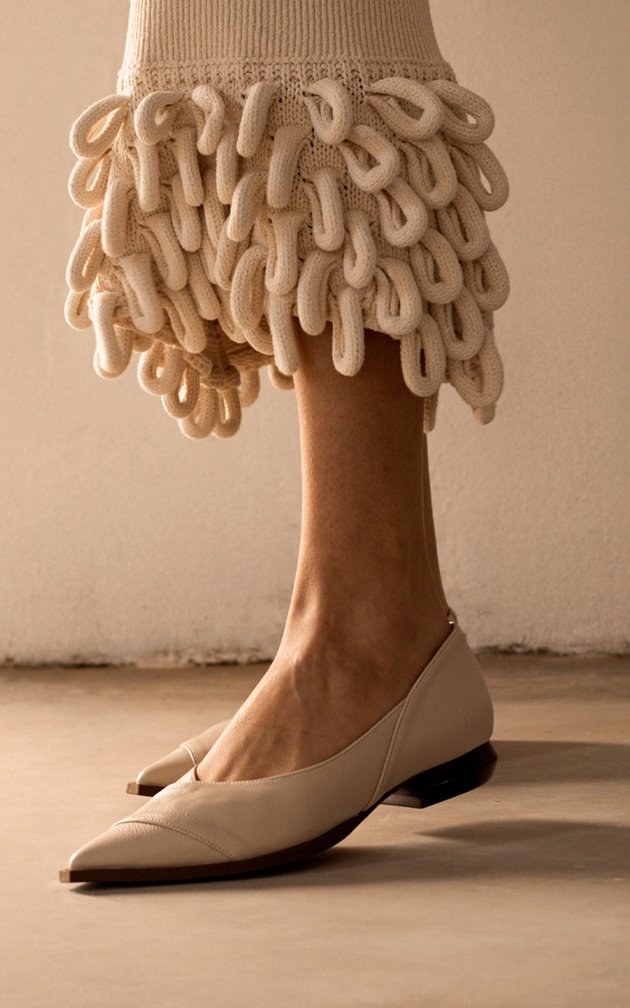O bico fino alongado projeta presença e confiança, enquanto o salto mini escultura sustenta com firmeza e originalidade. Cada elemento reforça a personalidade marcante da mulher que não se limita ao óbvio.