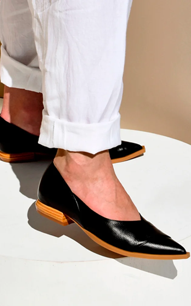 O bico fino alongado projeta presença e confiança, enquanto o salto mini escultura sustenta com firmeza e originalidade. Cada elemento reforça a personalidade marcante da mulher que não se limita ao óbvio.