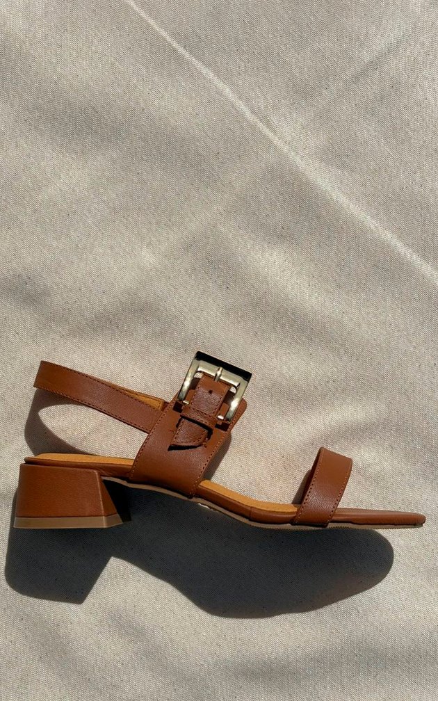 A tira fina e a fivela robusta em metal criam um contraste preciso entre leveza e presença. O salto bloco baixo, forrado em couro, traduz estabilidade e refinamento, acompanhando o movimento com conforto e firmeza.