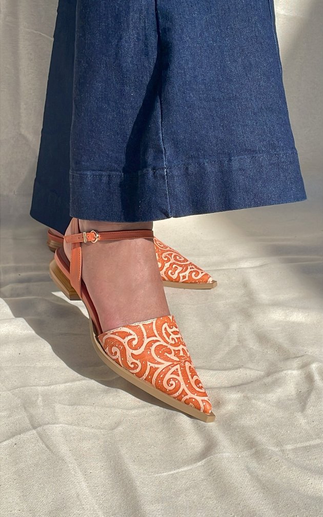 O recorte slingback com tira ajustável abraça o calcanhar com suavidade, garantindo segurança no caminhar. O cabedal trabalhado em textura desenhada valoriza o olhar artesanal e contemporâneo, trazendo informação de moda mesmo nas produções mais simples.