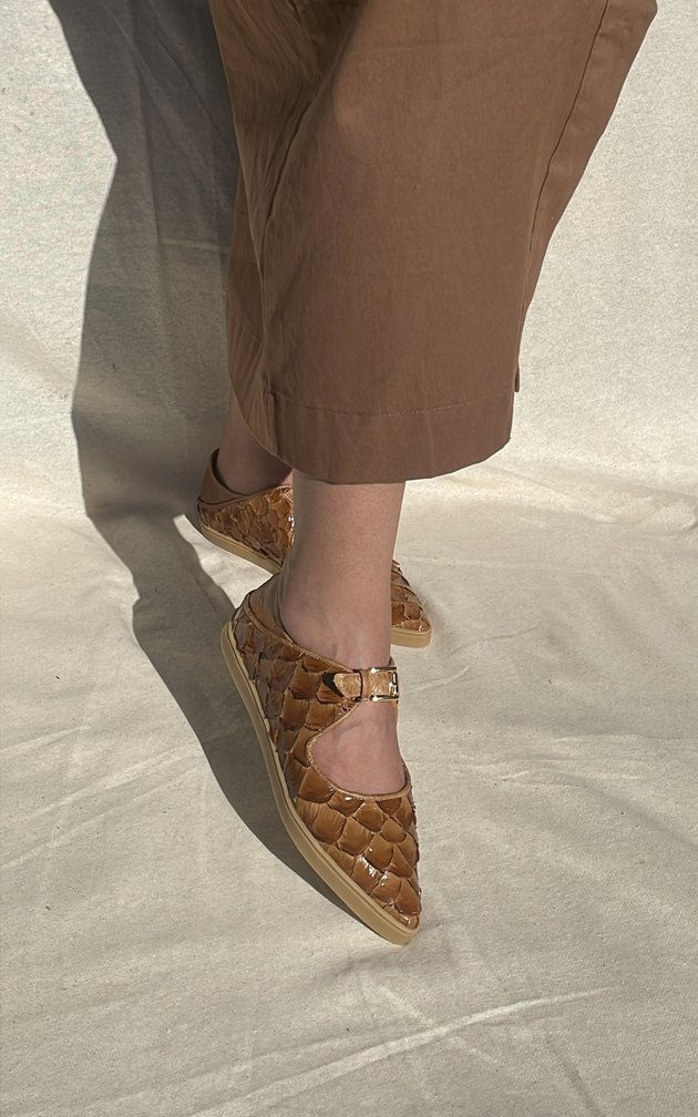 Este flat traz a estética Magnata para o dia a dia com elegância descomplicada. O recorte vazado e a fivela no peito do pé desenham uma silhueta limpa e feminina, enquanto o brilho sutil do couro realça a sofisticação em movimento.